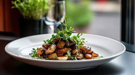 A beautifully arranged gourmet dish featuring fresh herbs, carefully plated for a luxurious dining experience. Perfect for restaurant or culinary themes.