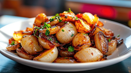 A vibrant plate of stir-fried onions garnished with fresh herbs. This dish offers a tantalizing aroma and a delicious flavor, perfect for any meal.