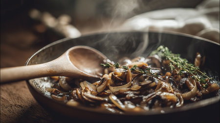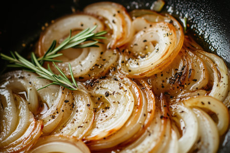 Deliciously sliced onions are slowly caramelizing in a hot skillet, sizzling in a mix of butter and olive oil, enhanced with soy sauce and fresh herbs for rich flavor, stirred to perfection.