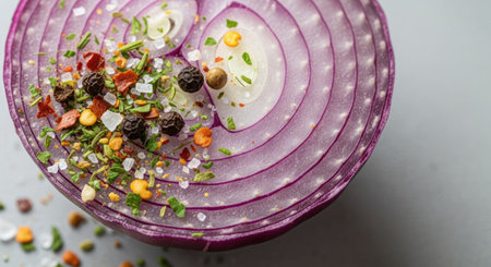 Sliced red onion with spices and herbs on a white background