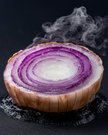 Artistic arrangement of freshly sliced red onions on a wooden cutting board, accompanied by a knife and enveloped in steam, showcasing culinary creativity and kitchen elegance.