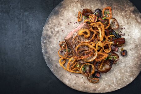 Close up caramelized onion on plate with fork on black background