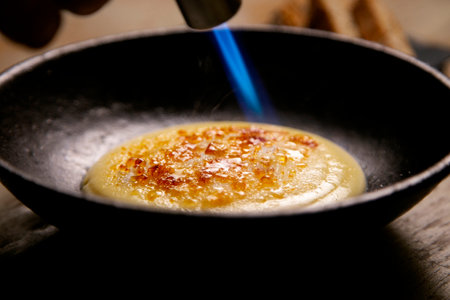 Chef Torch Caramelizing Creme Brulee in Low-Key Lighting