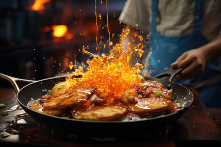 A dynamic cooking scene showcasing sparks and flames as a chef expertly fries ingredients in a pan, capturing the essence of culinary creativity and passion.