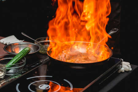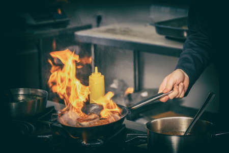 Chef cooking with flame in a frying pan on a kitchen stove..