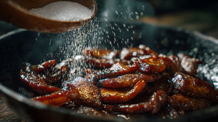 A sizzling pan of crispy bacon strips cooking on a stovetop, with golden-brown edges and the delicious aroma wafting through the kitchen.