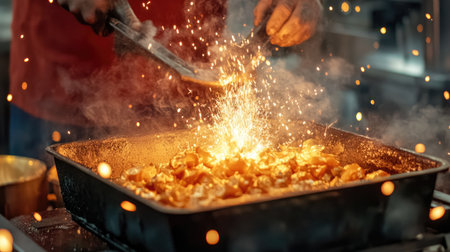 A captivating kitchen scene showcasing the dynamic moment of cooking with sizzling ingredients and vibrant sparks flying, creating a lively culinary atmosphere.