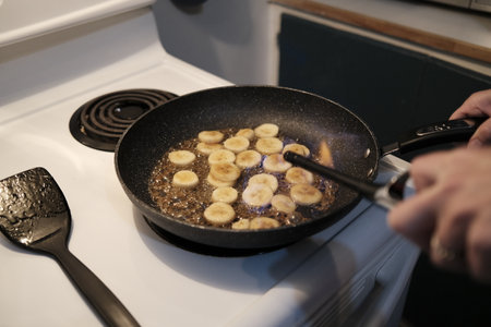 A frying pan on the stove releases steam while cooking a delicious meal. The scene captures the essence of home cooking, creating a warm and inviting atmosphere.