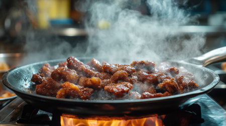 This image showcases meat sizzling in a frying pan, surrounded by smoke and steam, highlighting the cooking process in a dynamic kitchen scene.
