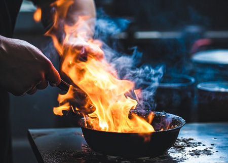 A skilled chef flambéing a sumptuous dish in a bustling restaurant kitchen during a late-night service. Generative AI