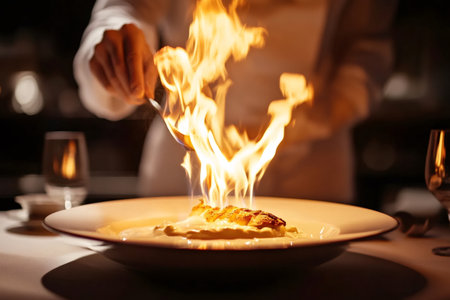 Professional chef using a spoon to flambe a dessert, creating a burst of flames tableside in a fine dining restaurant