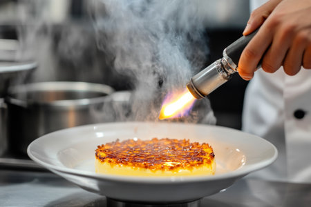 A skilled chef focuses on caramelizing sugar on a creamy creme brulee using a blowtorch in a professional kitchen. The flame creates an engaging culinary moment during dessert preparation.