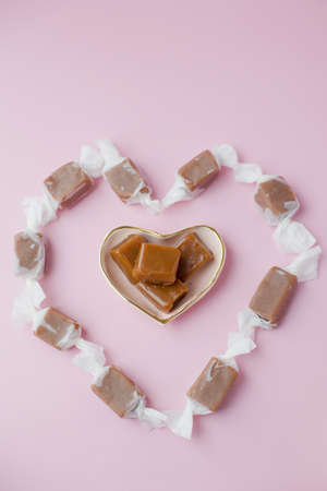 Heart shaped caramel candy fudge in paper wrapping on a pink background with copy space