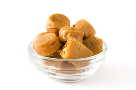 Toffee candies on cutting board with melted caramel in glass jar nearby on white background.