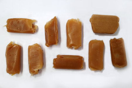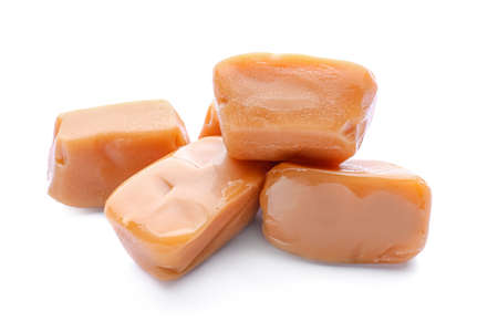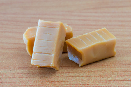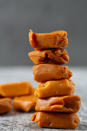 Soft caramel candies. Butterscotch toffee pieces on grey stone surface