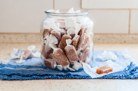 Fresh caramel vanilla fudge candies scattered from clip top glass jar on a tablecloth. Tasty chewy bonbons made of milk and sugar. Square pieces of delicious soft sweets. Front view.