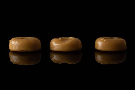 Group of seven whole sweet golden caramel candy isolated on black glass
