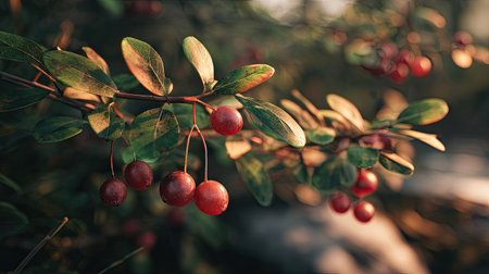 Detailed focus on the forest's wild berries reveals their natural texture, vibrant red hues contrasting with lush green foliage