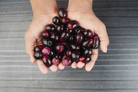top view of black plum on hand