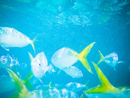 Group of marine fish forming a dynamic school, swimming through clear turquoise water beneath sunlit surface, showcasing vibrant ocean life, motion and underwater harmony