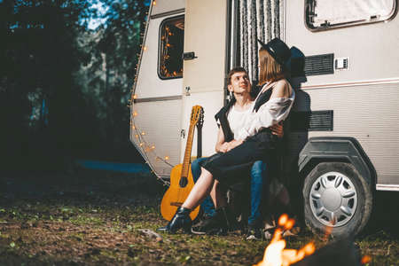 Young couple in love in stylish fashionable outfit romantic weekend wedding trip against background of camper in woods forest road trip