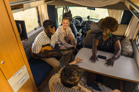 Happy interracial group of good friends on a summer road traveling, sitting inside their comfortable modern motorhome, playing the guitar, talking and laughing. RVs interior. High quality photo