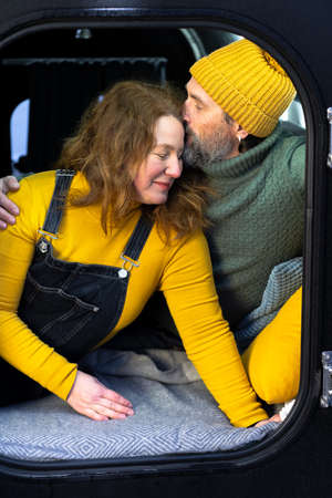 Loving mature couple in mini camper traveling. Man kiss woman on romantic mini camper roud trip enjoying time together. Middle aged couple having fun on winter vacation - Travel, love concept.