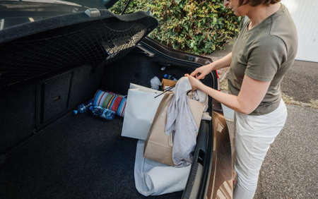 Overhead view of Young woman unloading car trunk with multiple bags after shopping near her garage door