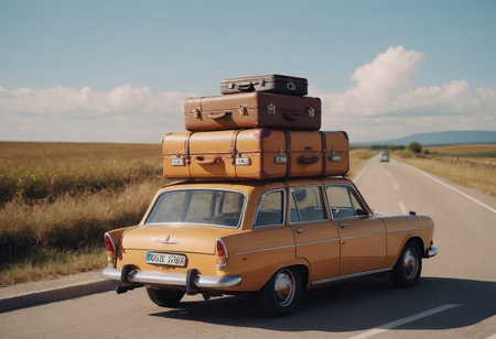 travelers' suitcases on the roof of an antique car driving along the road. The concept of memory