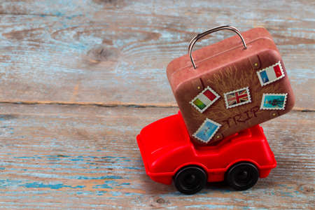 Vintage suitcase and car toy, nostalgic, travel and adventure concept
