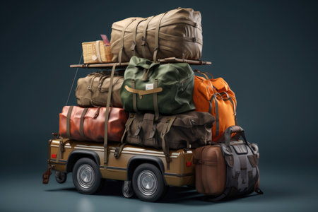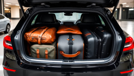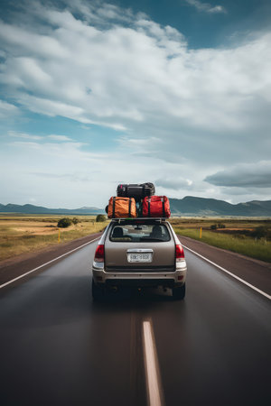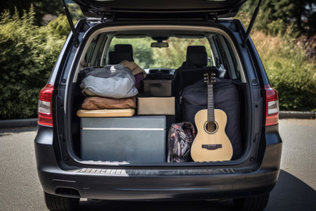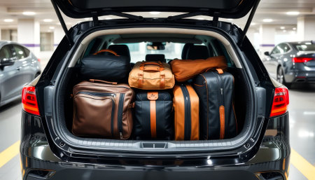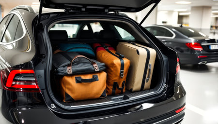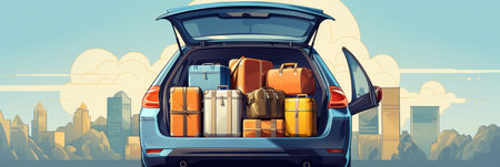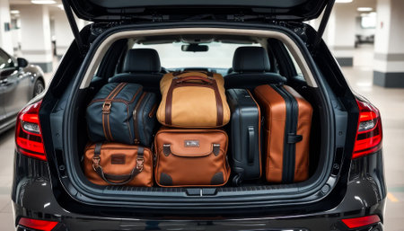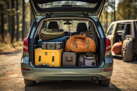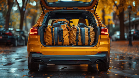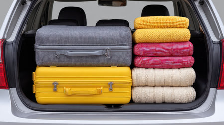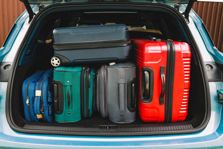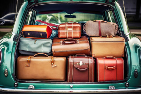 Luggage and travel bags are neatly packed in a car trunk, all set for an exciting holiday road trip and vacation adventure.