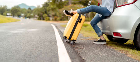 Car travel of woman journey with suitcase open hatchback car at mountain road and street in summer vacation road trip on holidays to destination, Traveler transportation vehicle people lifestyle
