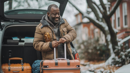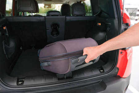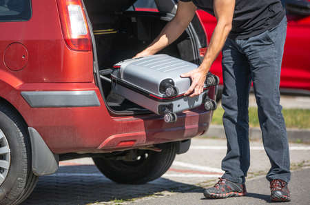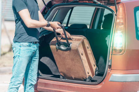 Father loading a luggage to the car, preparing for a vacation or holiday abroad, transportation concept