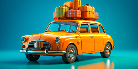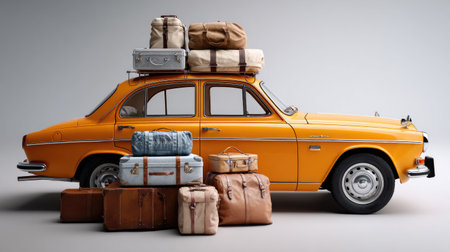 A vibrant yellow vintage car is adorned with a collection of stylish luggage on its roof, creating a perfect travel vibe. Ideal for themes of exploration, adventure, and nostalgia.