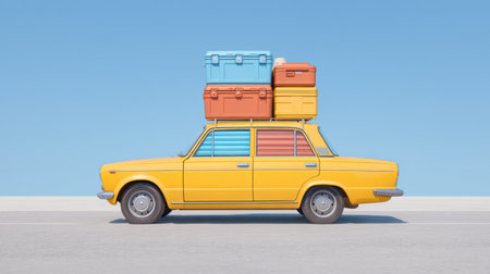 A vintage yellow car showcases colorful luggage stacked on its roof against a serene blue sky, embodying travel spirit and adventure, ideal for summer journeys.