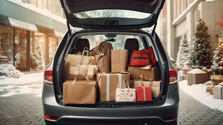 Car trunk filled with shopping bags. Season and holiday background. Shopping idea. Copy space.