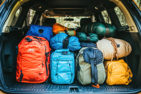 Car trunk filled with camping gear and supplies, packed tightly for travel, showing various bags, containers, and equipment ready for outdoor adventure, conveying sense of preparedness