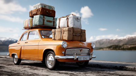 A classic orange car stands by a picturesque lake, loaded with vintage luggage, embodying a sense of adventure and nostalgia in a stunning natural setting.
