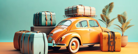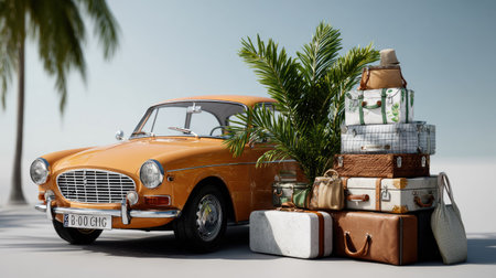 A vibrant vintage orange car stands next to a stylish arrangement of travel luggage and tropical plants, creating a lively and adventurous travel scene perfect for holiday themes.