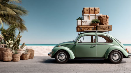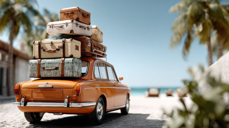A charming vintage car parked near a scenic beach, adorned with various luggage on its rooftop, surrounded by tropical palm trees and serene ocean views.