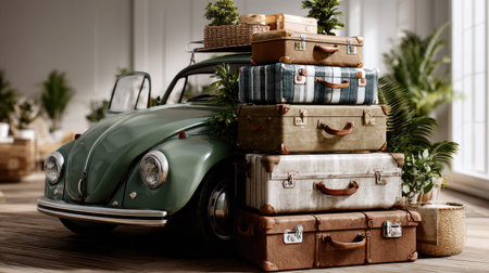 A stylish vintage car sits amidst a stack of retro suitcases indoors, surrounded by lush green plants, capturing a cozy and nostalgic atmosphere perfect for travel enthusiasts.