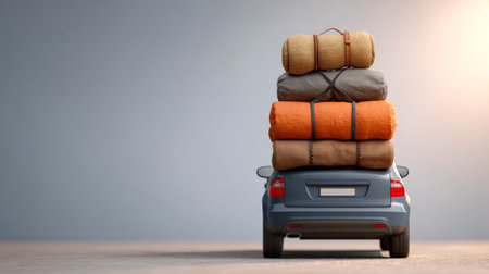 Car roof loaded with rolled sleeping bags, camping gear strapped down, representing adventurous summer road trip preparation and outdoor exploration spirit