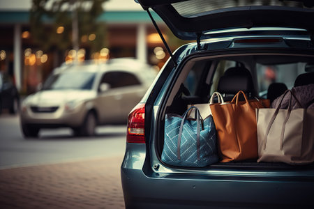 Shopping Bags in Car Trunk at Mall Parking Lot. AI