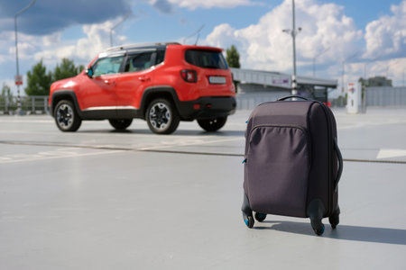 A suitcase in the background of a car in a parking lot. Travel concept
