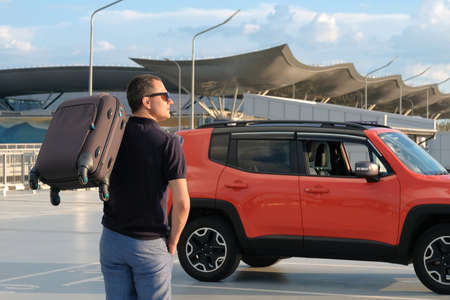 Young businessman with a suitcase in his hand at the airport parking. vacation concept.