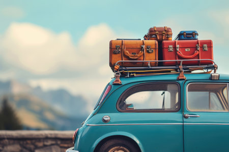 A charming vintage car carrying stacked colorful luggage, perfect for evoking travel dreams and adventures in marketing and creative projects.