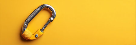 Sturdy Metal Carabiner Clip with Loop on Bright Yellow Background for Outdoor Activities, Climbing, Hiking, and Camping Equipment AI Generative