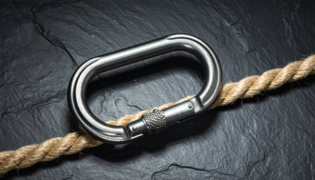 Close-up of a carabiner attached to a rope on rocky surface, symbolizing safety, adventure, and mountain climbing.