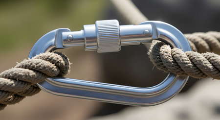 A symbol of unwavering strength and security, this robust metal carabiner with its screw lock firmly clasps a heavy-duty rope.