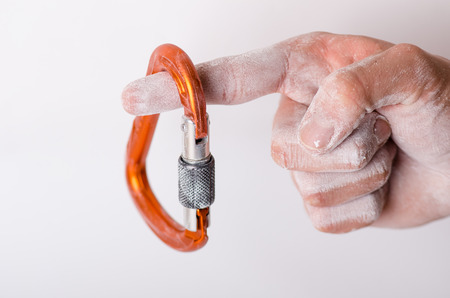 Man´s hand holding a carabine on a rope. Climbing equipment isolated on a white background. Hand in powder chalk magnesium.